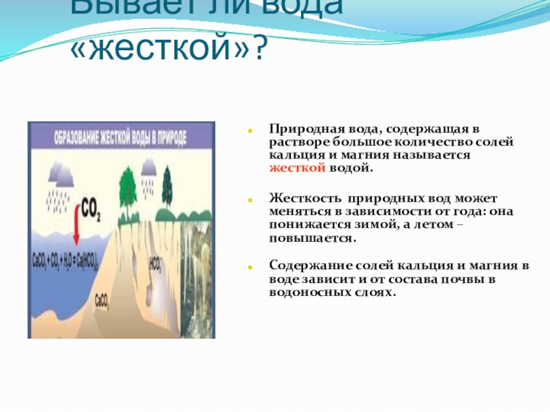 Содержание солей кальция и магния в воде зависит и от состава почвы в водоносных слоях.