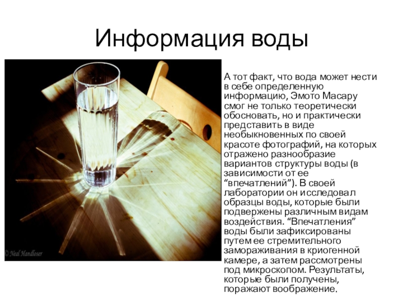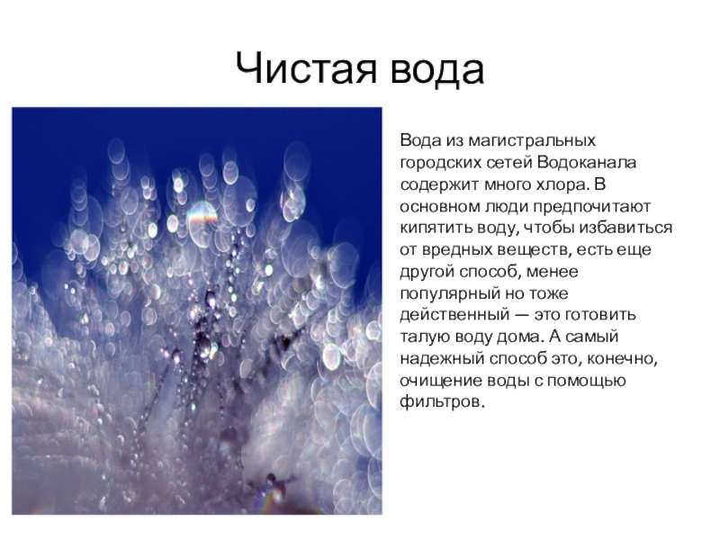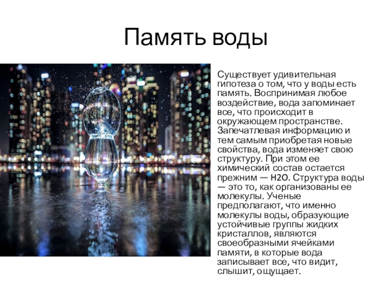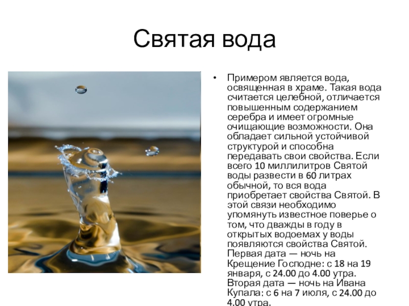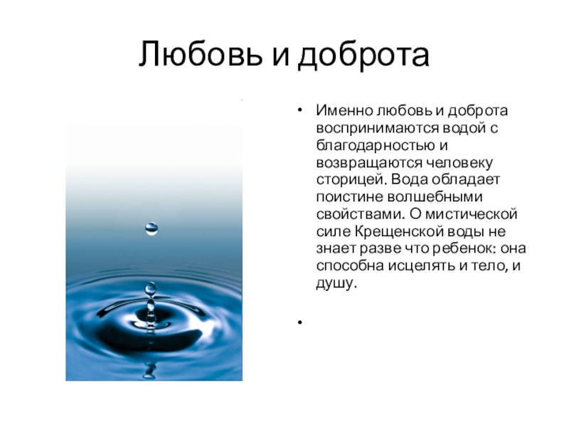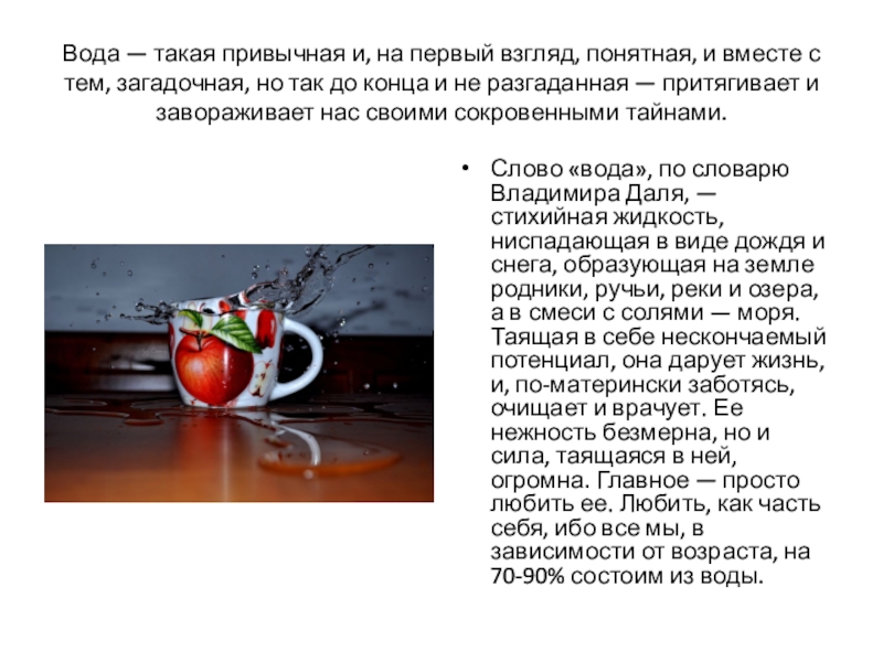 Слово «вода», по словарю Владимира Даля, — стихийная жидкость, ниспадающая в виде дождя и снега, образующая на земле родники, ручьи, реки и озера, а в смеси с солями — моря. Таящая в себе нескончаемый потенциал, она дарует жизнь, и, по-матерински заботясь, очищает и врачует. Ее нежность безмерна, но и сила, таящаяся в ней, огромна. Главное — просто любить ее. Любить, как часть себя, ибо все мы, в зависимости от возраста, на 70-90% состоим из воды.
