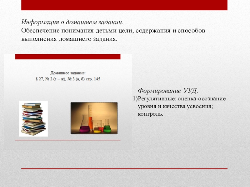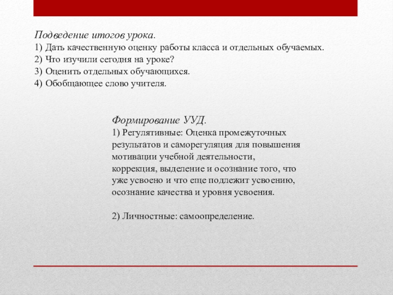 1) Регулятивные: Оценка промежуточных результатов и саморегуляция для повышения мотивации учебной деятельности, коррекция, выделение и осознание того, что уже усвоено и что еще подлежит усвоению, осознание качества и уровня усвоения.