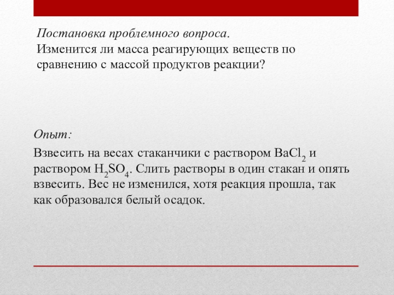 Взвесить на весах стаканчики с раствором BaCl2 и раствором H2SO4. Слить растворы в один стакан и опять взвесить. Вес не изменился, хотя реакция прошла, так как образовался белый осадок.