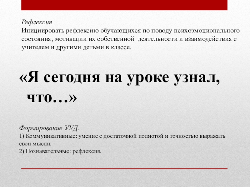 1) Познавательные: Выделение и формулирование познавательной цели, рефлексия способов и условий действия. Анализ и синтез объектов.