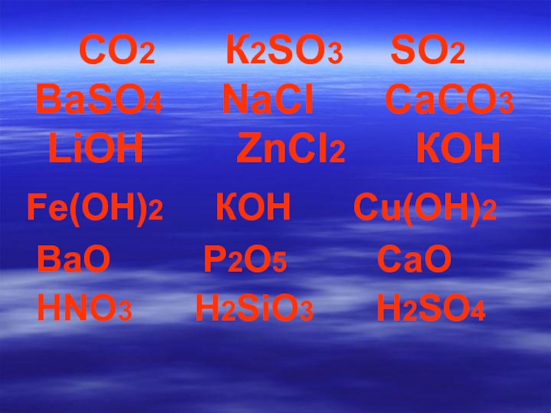 H2SO4 Na2CO3 Cl2O7 FeCl2 Zn(OH)2 P2O5 Ca3(PO4)2 LiOH H2B4O7 BaO Cu(OH)2