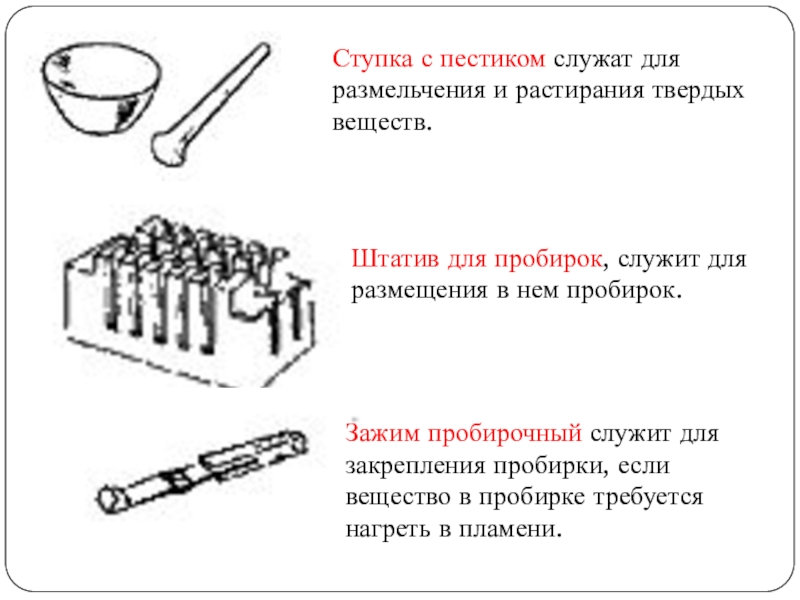Слайд 24Ступка с пестиком служат для размельчения и растирания твердых веществ.
