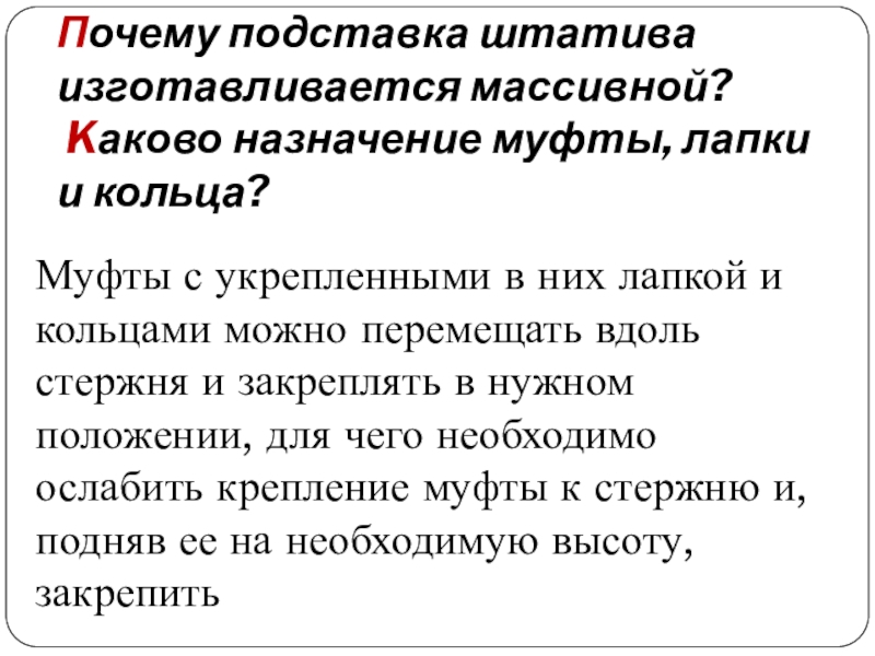 Слайд 8Почему стержни лапок и колец располагают сверху муфты?