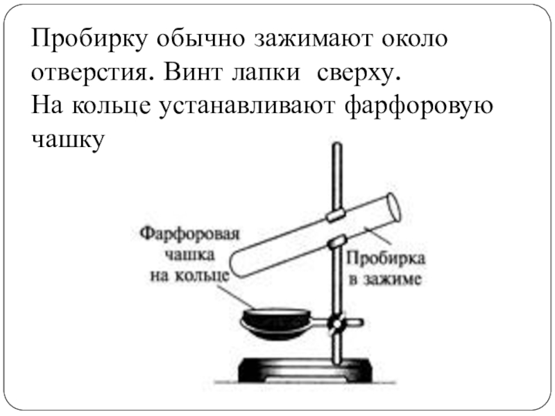 Слайд 9Пробирку обычно зажимают около отверстия. Винт лапки сверху.