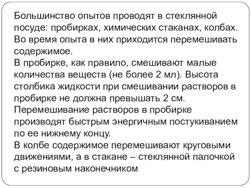 В пробирке, как правило, смешивают малые количества веществ (не более 2 мл). Высота столбика жидкости при смешивании растворов в пробирке не должна превышать 2 см. Перемешивание растворов в пробирке производят быстрым энергичным постукиванием по ее нижнему концу.