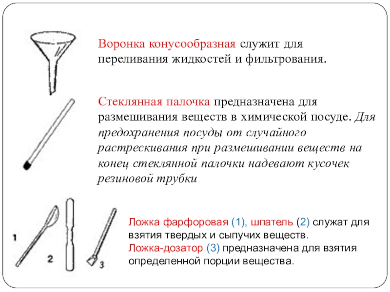 Ложка фарфоровая (1), шпатель (2) служат для взятия твердых и сыпучих веществ.