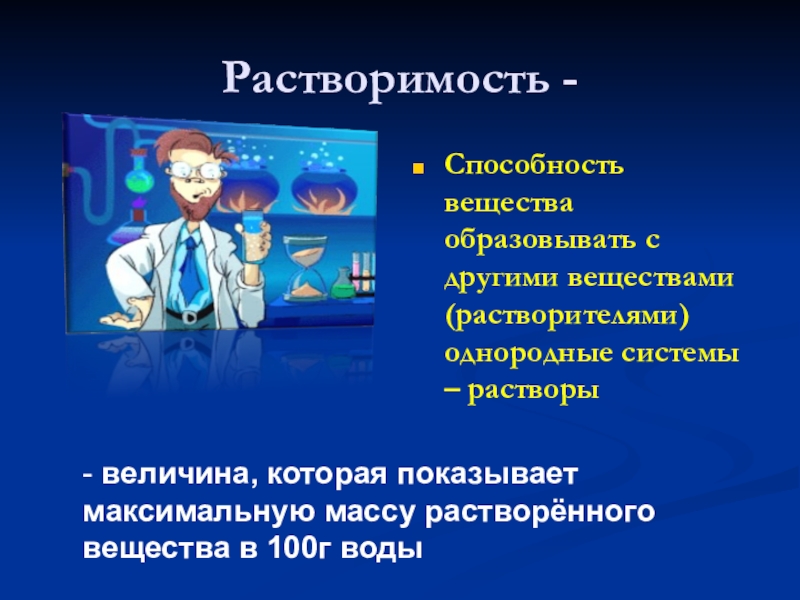 - величина, которая показывает максимальную массу растворённого вещества в 100г воды
