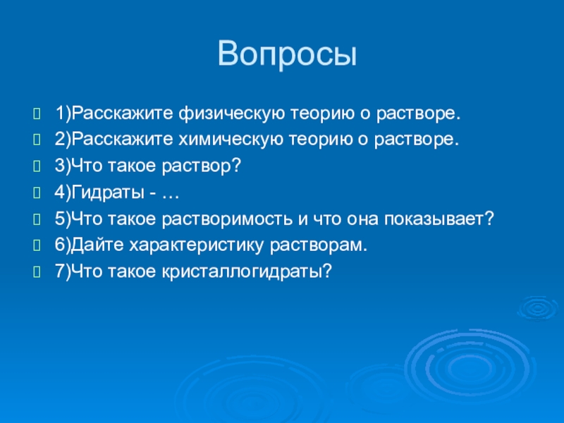 Химический процесс –заключающийся во взаимодействии молекул растворенного вещества и растворителя, а также образования гидратов.