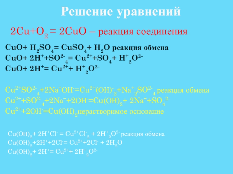 Cu(ОН)2+ 2H+Cl- = Cu2+Cl-2 + 2H+2O2- реакция обмена