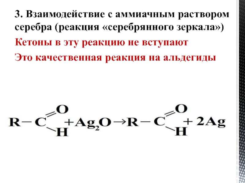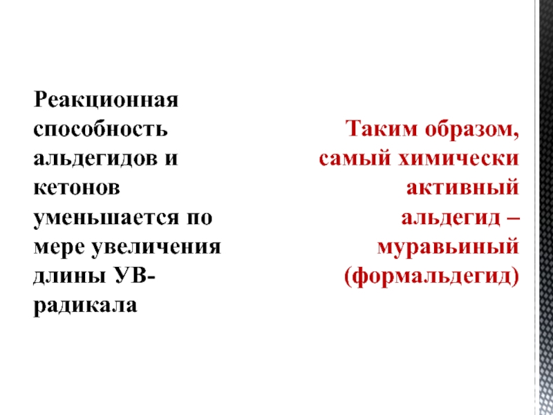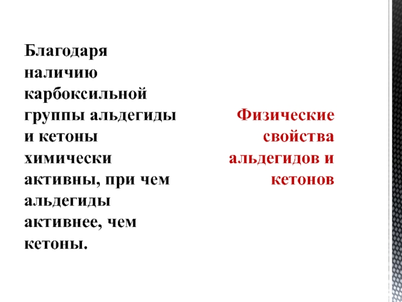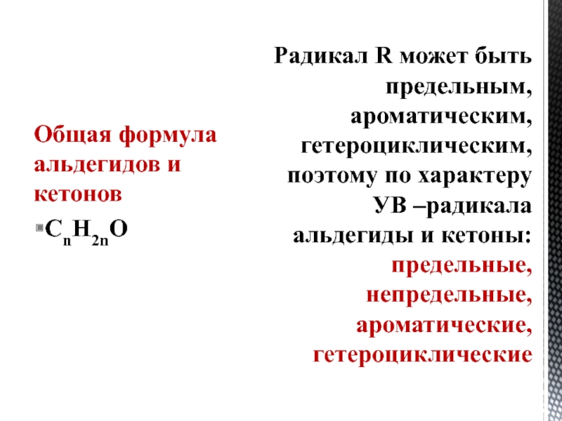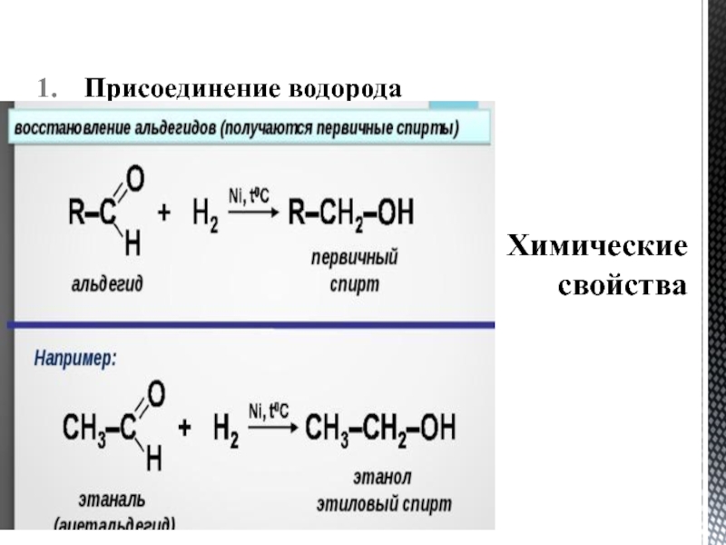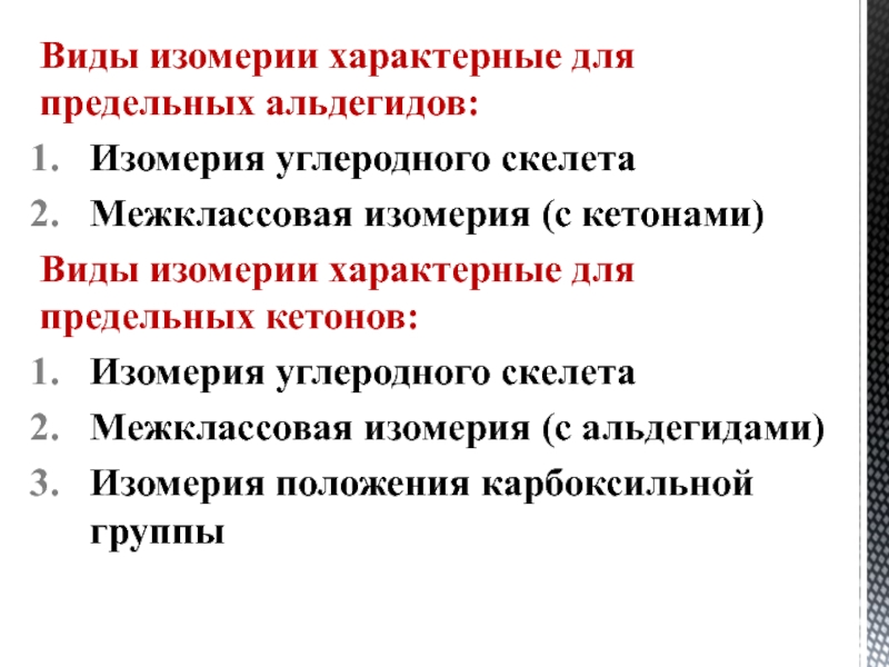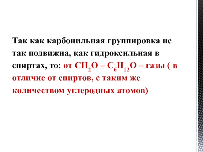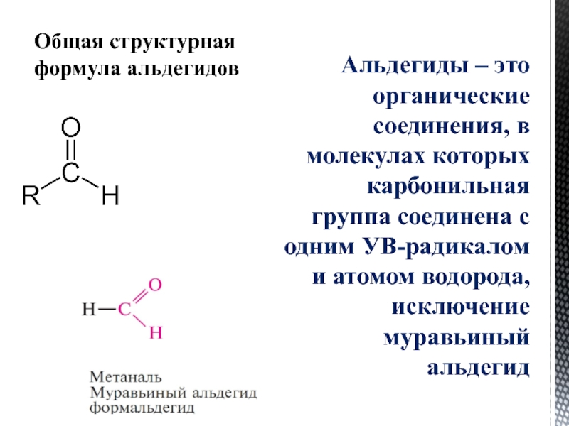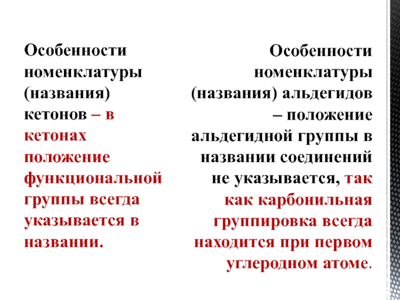Особенности номенклатуры (названия) альдегидов – положение альдегидной группы в названии соединений не указывается, так как карбонильная группировка всегда находится при первом углеродном атоме.