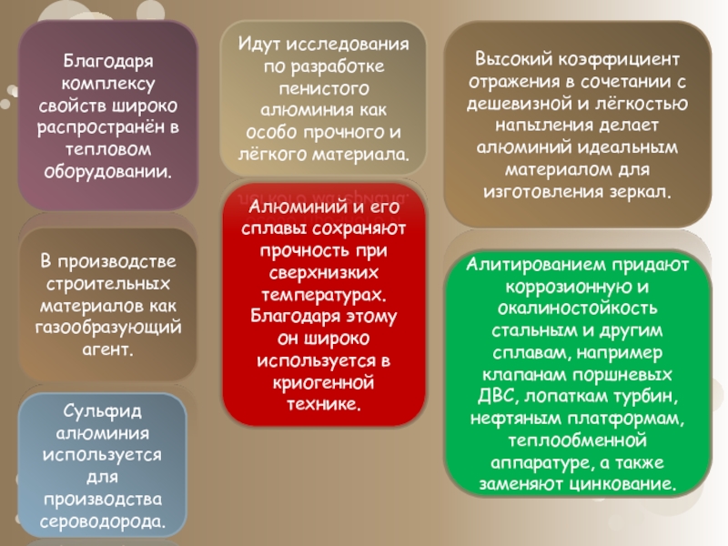 Идут исследования по разработке пенистого алюминия как особо прочного и лёгкого материала.