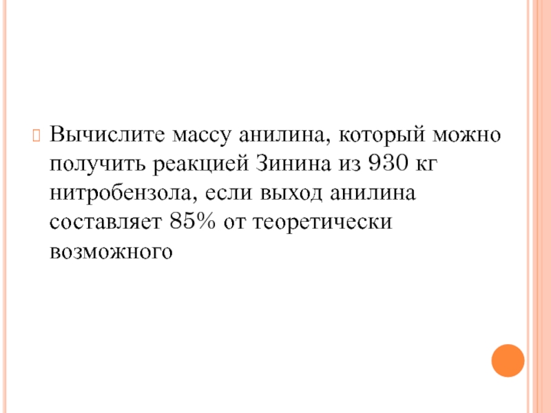 Слайд 9Вычислите массу анилина, который можно получить реакцией Зинина из 930 кг