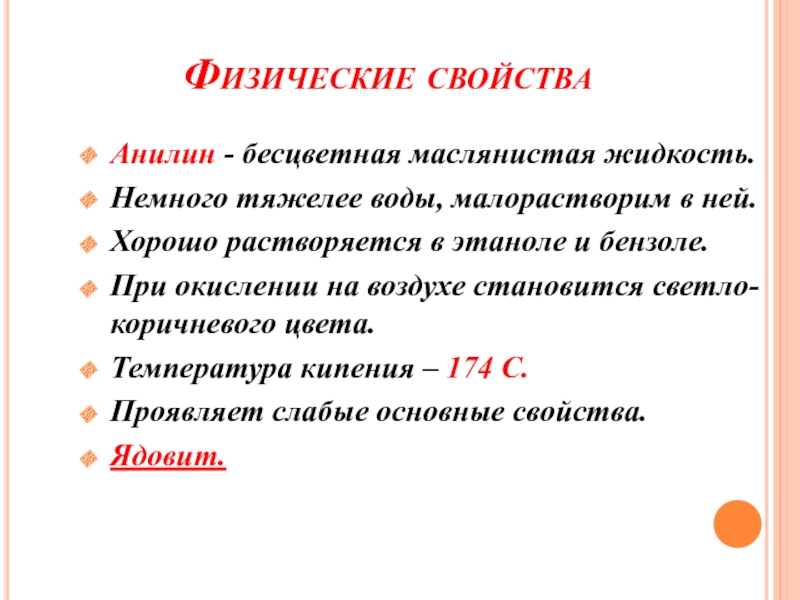 Физические свойства Анилин - бесцветная маслянистая жидкость.Немного тяжелее воды, малорастворим в ней.Хорошо растворяется в этаноле и бензоле.При