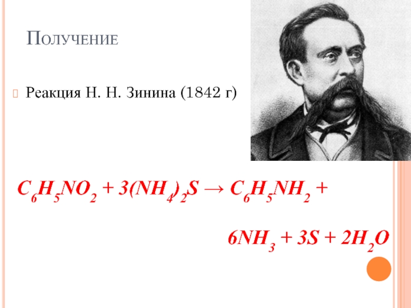 ПолучениеРеакция Н. Н. Зинина (1842 г)C6H5NO2 + 3(NH4)2S → C6H5NH2 +