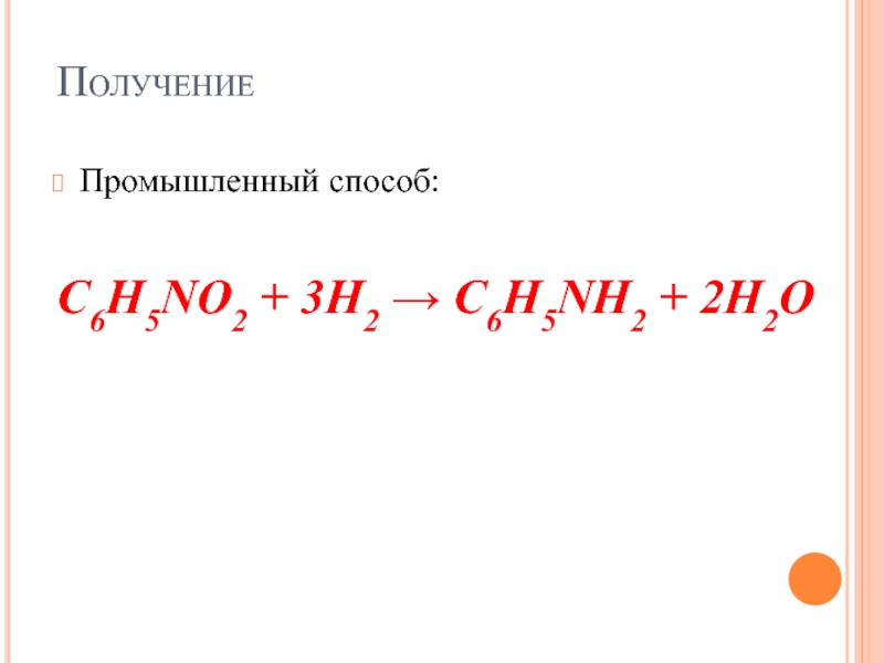 ПолучениеПромышленный способ:C6H5NO2 + 3Н2 → C6H5NH2 + 2Н2О