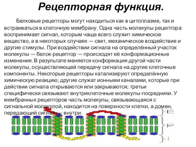 так и встраиваться в клеточную мембрану. Одна часть молекулы рецептора воспринимает сигнал, которым чаще всего служит химическое вещество, а в некоторых случаях — свет, механическое воздействие и другие стимулы. При воздействии сигнала на определённый участок молекулы — белок-рецептор — происходят её конформационные изменения. В результате меняется конформация другой части молекулы, осуществляющей передачу сигнала на другие клеточные компоненты. Некоторые рецепторы катализируют определённую химическую реакцию; другие служат ионными каналами, которые при действии сигнала открываются или закрываются; третьи специфически связывают внутриклеточные молекулы-посредники. У мембранных рецепторов часть молекулы, связывающаяся с сигнальной молекулой, находится на поверхности клетки, а домен, передающий сигнал, — внутри.