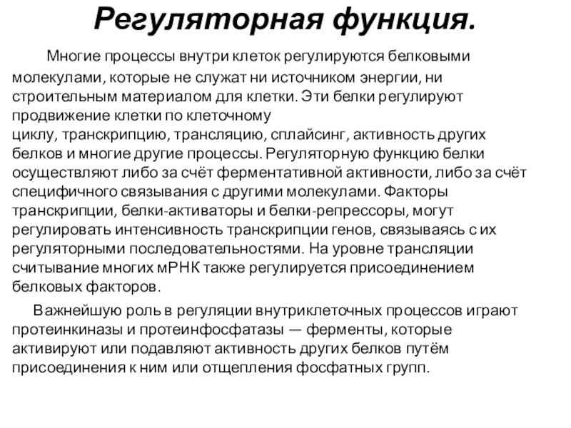 которые не служат ни источником энергии, ни строительным материалом для клетки. Эти белки регулируют продвижение клетки по клеточному циклу, транскрипцию, трансляцию, сплайсинг, активность других белков и многие другие процессы. Регуляторную функцию белки осуществляют либо за счёт ферментативной активности, либо за счёт специфичного связывания с другими молекулами. Факторы транскрипции, белки-активаторы и белки-репрессоры, могут регулировать интенсивность транскрипции генов, связываясь с их регуляторными последовательностями. На уровне трансляции считывание многих мРНК также регулируется присоединением белковых факторов.