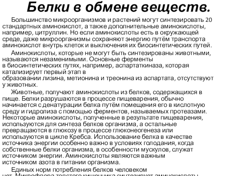 стандартных аминокислот, а также дополнительные аминокислоты, например, цитруллин. Но если аминокислоты есть в окружающей среде, даже микроорганизмы сохраняют энергию путём транспорта аминокислот внутрь клеток и выключения их биосинтетических путей.