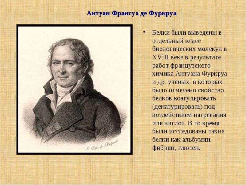 1728 г. итальянцем Якопо Бартоломео Беккари из пшеничной муки. Белки были выделены в отдельный класс биологических молекул в XVIII веке в результате работ французского химика Антуана де Фуркруа. Исследованы белки: альбумин («яичный белок»), фибрин (белок из крови) и глютен из зерна пшеницы.