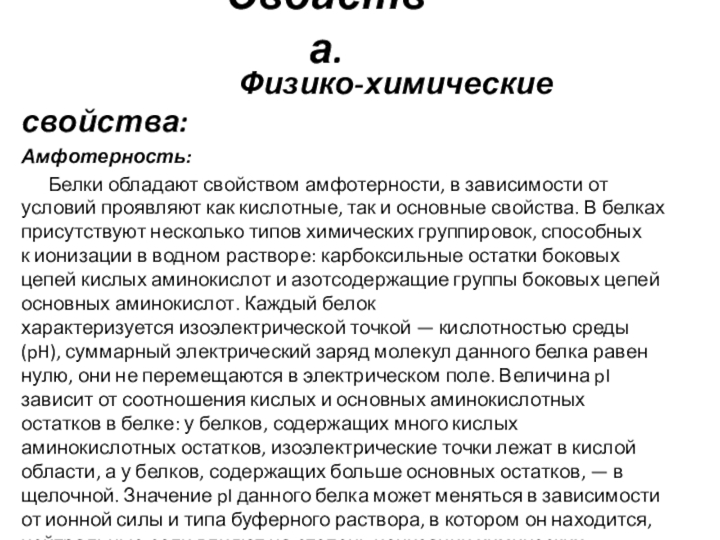 Белки обладают свойством амфотерности, в зависимости от условий проявляют как кислотные, так и основные свойства. В белках присутствуют несколько типов химических группировок, способных к ионизации в водном растворе: карбоксильные остатки боковых цепей кислых аминокислот и азотсодержащие группы боковых цепей основных аминокислот. Каждый белок характеризуется изоэлектрической точкой — кислотностью среды (pH), суммарный электрический заряд молекул данного белка равен нулю, они не перемещаются в электрическом поле. Величина pI зависит от соотношения кислых и основных аминокислотных остатков в белке: у белков, содержащих много кислых аминокислотных остатков, изоэлектрические точки лежат в кислой области, а у белков, содержащих больше основных остатков, — в щелочной. Значение pI данного белка может меняться в зависимости от ионной силы и типа буферного раствора, в котором он находится, нейтральные соли влияют на степень ионизации химических группировок белка.
