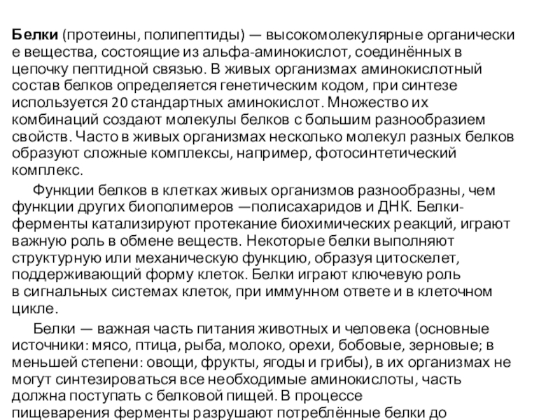 Слайд 2 Белки (протеины, полипептиды) — высокомолекулярные органические вещества, состоящие из альфа-аминокислот, соединённых в цепочку
