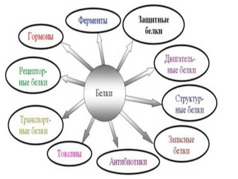 Классификация белков по их функциям достаточно условна, так как один и тот же белок может выполнять несколько функций. Многие функции белки выполняют благодаря своей ферментативной активности. Ферментами являются двигательный белок миозин, регуляторные белки протеинкиназы, транспортный белок натрий-калиевая аденозинтрифосфатаза и др.