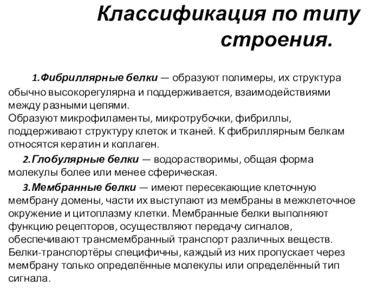 1.Фибриллярные белки — образуют полимеры, их структура обычно высокорегулярна и поддерживается, взаимодействиями между разными цепями. Образуют микрофиламенты, микротрубочки, фибриллы, поддерживают структуру клеток и тканей. К фибриллярным белкам относятся кератин и коллаген.
