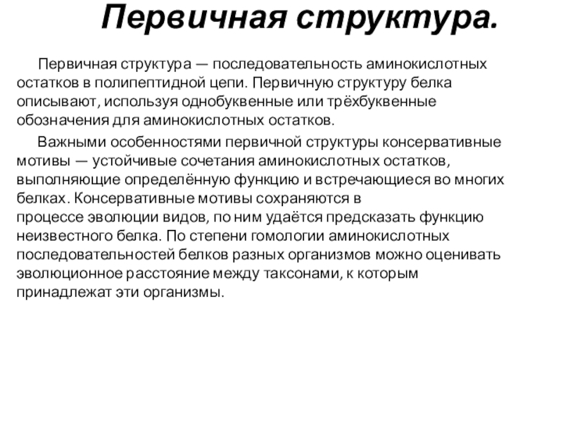 Первичная структура — последовательность аминокислотных остатков в полипептидной