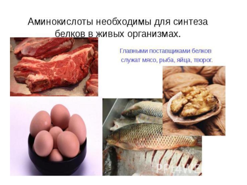 Белки — важная часть питания животных и человека (основные источники: мясо, птица, рыба, молоко, орехи, бобовые, зерновые; в меньшей степени: овощи, фрукты, ягоды и грибы), в их организмах не могут синтезироваться все необходимые аминокислоты, часть должна поступать с белковой пищей. В процессе пищеварения ферменты разрушают потреблённые белки до аминокислот, которые используются для биосинтеза собственных белков организма или подвергаются дальнейшему распаду для получения энергии.