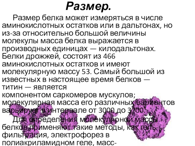 или в дальтонах, но из-за относительно большой величины молекулы масса белка выражается в производных единицах — килодальтонах. Белки дрожжей, состоят из 466 аминокислотных остатков и имеют молекулярную массу 53. Самый большой из известных в настоящее время белков —титин — является компонентом саркомеров мускулов; молекулярная масса его различных вариантов варьирует в интервале от 3000 до 3700.