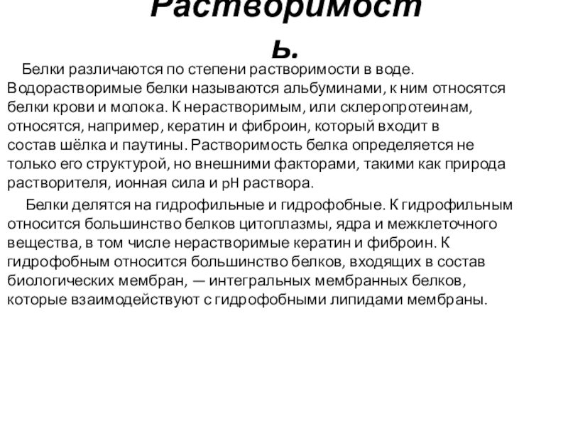 ним относятся белки крови и молока. К нерастворимым, или склеропротеинам, относятся, например, кератин и фиброин, который входит в состав шёлка и паутины. Растворимость белка определяется не только его структурой, но внешними факторами, такими как природа растворителя, ионная сила и pH раствора.