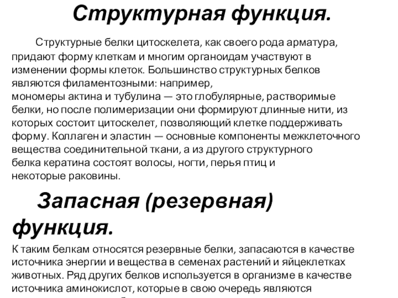 придают форму клеткам и многим органоидам участвуют в изменении формы клеток. Большинство структурных белков являются филаментозными: например, мономеры актина и тубулина — это глобулярные, растворимые белки, но после полимеризации они формируют длинные нити, из которых состоит цитоскелет, позволяющий клетке поддерживать форму. Коллаген и эластин — основные компоненты межклеточного вещества соединительной ткани, а из другого структурного белка кератина состоят волосы, ногти, перья птиц и некоторые раковины.