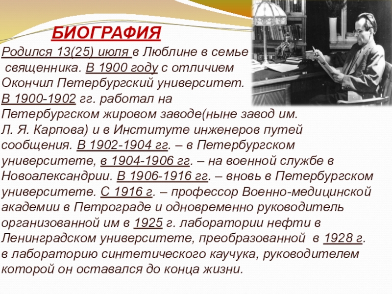 Он показал, что дивинил и все диеновые углеводороды способны давать каучукоподобные продукты.