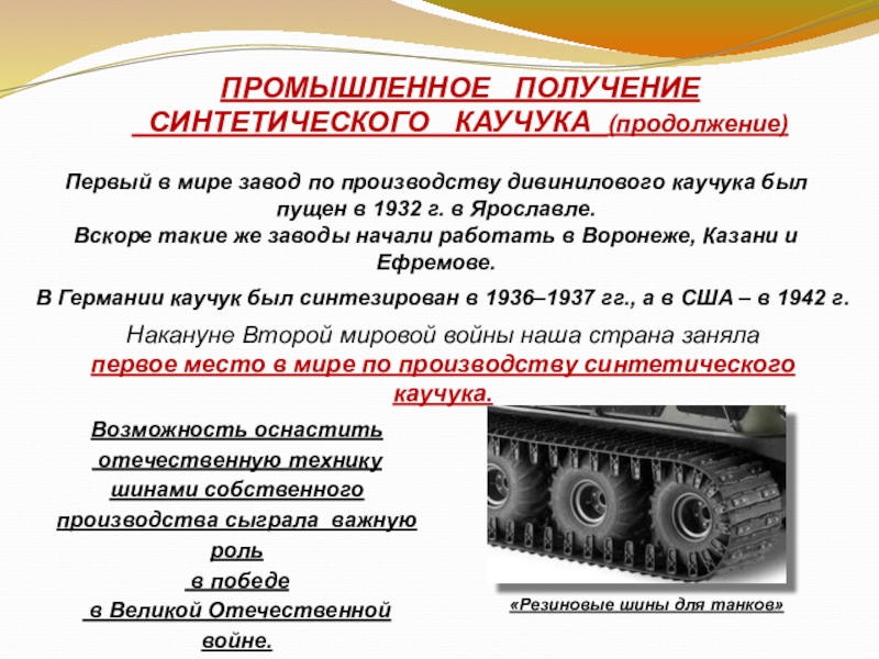 В Германии каучук был синтезирован в 1936–1937 гг., а в США – в 1942 г.