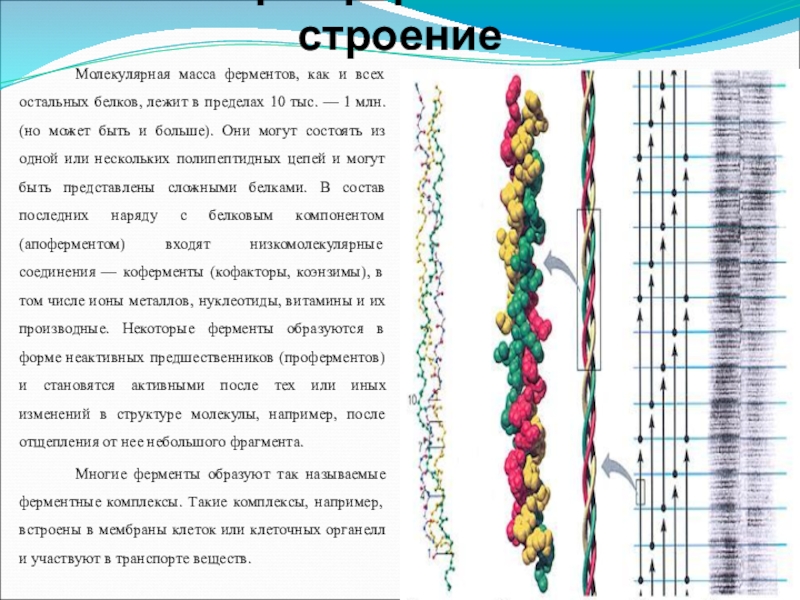 белков, лежит в пределах 10 тыс. — 1 млн. (но может быть и больше). Они могут состоять из одной или нескольких полипептидных цепей и могут быть представлены сложными белками. В состав последних наряду с белковым компонентом (апоферментом) входят низкомолекулярные соединения — коферменты (кофакторы, коэнзимы), в том числе ионы металлов, нуклеотиды, витамины и их производные. Некоторые ферменты образуются в форме неактивных предшественников (проферментов) и становятся активными после тех или иных изменений в структуре молекулы, например, после отщепления от нее небольшого фрагмента.