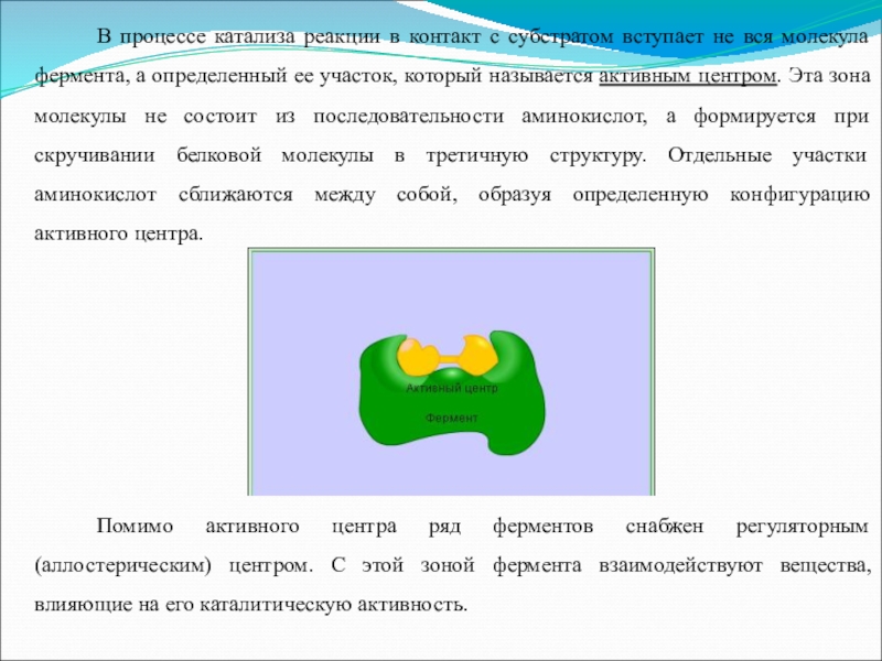 молекула фермента, а определенный ее участок, который называется активным центром. Эта зона молекулы не состоит из последовательности аминокислот, а формируется при скручивании белковой молекулы в третичную структуру. Отдельные участки аминокислот сближаются между собой, образуя определенную конфигурацию активного центра.