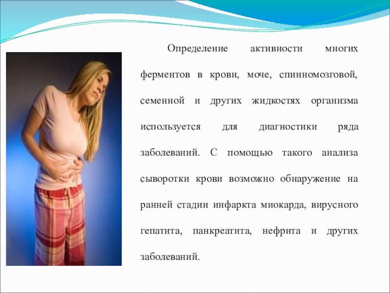 Слайд 19 Определение активности многих ферментов в крови, моче, спинномозговой, семенной и других