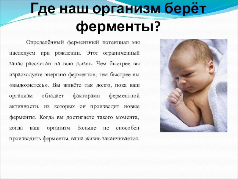 Этот ограниченный запас рассчитан на всю жизнь. Чем быстрее вы израсходуете энергию ферментов, тем быстрее вы «выдохнетесь». Вы живёте так долго, пока ваш организм обладает факторами ферментной активности, из которых он производит новые ферменты. Когда вы достигаете такого момента, когда ваш организм больше не способен производить ферменты, ваша жизнь заканчивается.
