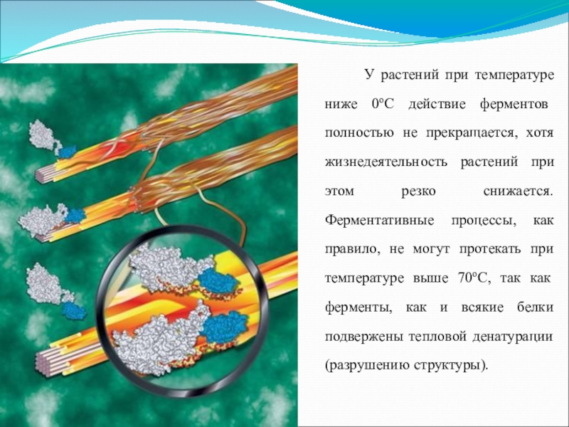 Слайд 13 У растений при температуре ниже 0oС действие ферментов полностью не прекращается,