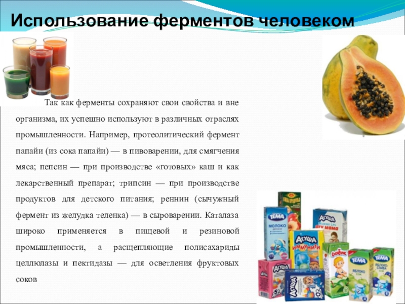 используют в различных отраслях промышленности. Например, протеолитический фермент папайи (из сока папайи) — в пивоварении, для смягчения мяса; пепсин — при производстве «готовых» каш и как лекарственный препарат; трипсин — при производстве продуктов для детского питания; реннин (сычужный фермент из желудка теленка) — в сыроварении. Каталаза широко применяется в пищевой и резиновой промышленности, а расщепляющие полисахариды целлюлазы и пектидазы — для осветления фруктовых соков