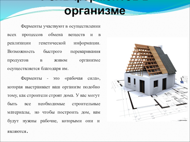 Ферменты - это «рабочая сила», которая выстраивает ваш организм подобно тому, как строители строят дома. У вас могут быть все необходимые строительные материалы, но чтобы построить дом, вам будут нужны рабочие, которыми они и являются.