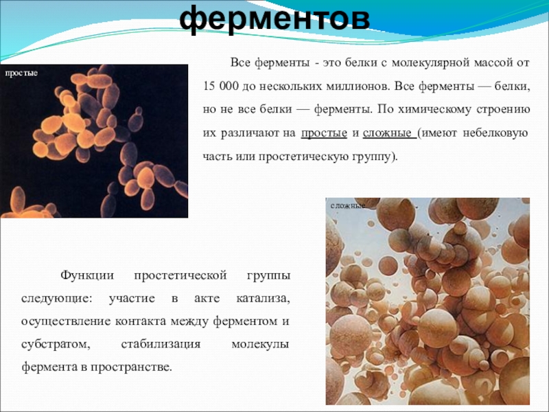 Все ферменты - это белки с молекулярной массой от 15 000 до нескольких миллионов. Все ферменты — белки, но не все белки — ферменты. По химическому строению их различают на простые и сложные (имеют небелковую часть или простетическую группу).