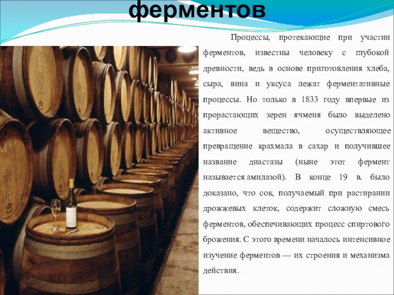 древности, ведь в основе приготовления хлеба, сыра, вина и уксуса лежат ферментативные процессы. Но только в 1833 году впервые из прорастающих зерен ячменя было выделено активное вещество, осуществляющее превращение крахмала в сахар и получившее название диастазы (ныне этот фермент называется амилазой). В конце 19 в. было доказано, что сок, получаемый при растирании дрожжевых клеток, содержит сложную смесь ферментов, обеспечивающих процесс спиртового брожения. С этого времени началось интенсивное изучение ферментов — их строения и механизма действия.