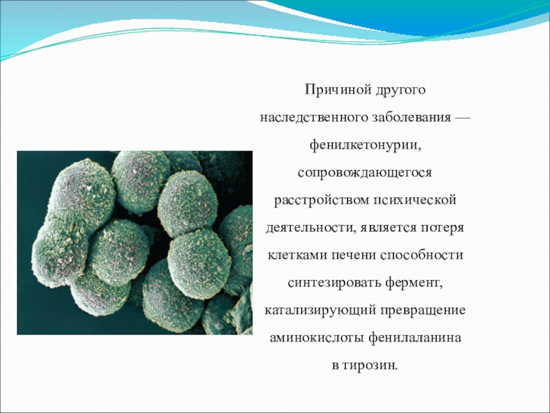 Слайд 18Причиной другого наследственного заболевания — фенилкетонурии, сопровождающегося расстройством психической деятельности, является