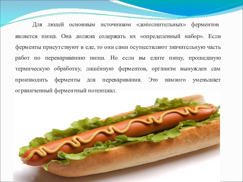 содержать их «определенный набор». Если ферменты присутствуют в еде, то они сами осуществляют значительную часть работ по перевариванию пищи. Но если вы едите пищу, прошедшую термическую обработку, лишённую ферментов, организм вынужден сам производить ферменты для переваривания. Это намного уменьшает ограниченный ферментный потенциал.