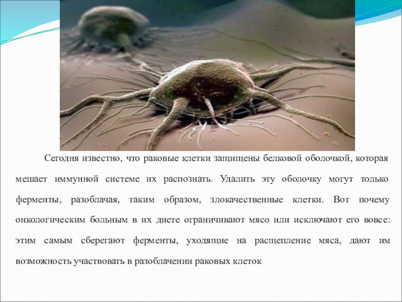 Слайд 8 Сегодня известно, что раковые клетки защищены белковой оболочкой, которая мешает иммунной
