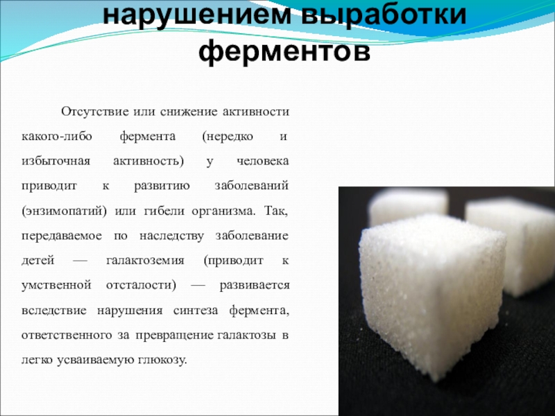 (нередко и избыточная активность) у человека приводит к развитию заболеваний (энзимопатий) или гибели организма. Так, передаваемое по наследству заболевание детей — галактоземия (приводит к умственной отсталости) — развивается вследствие нарушения синтеза фермента, ответственного за превращение галактозы в легко усваиваемую глюкозу.