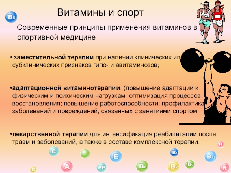 адаптационной витаминотерапии. (повышение адаптации к физическим и психическим нагрузкам; оптимизация процессов восстановления; повышение работоспособности; профилактика заболеваний и повреждений, связанных с занятиями спортом.