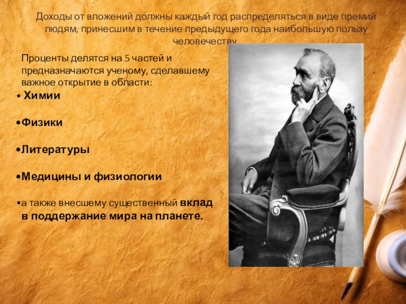 Доходы от вложений должны каждый год распределяться в виде премий людям, принесшим в течение предыдущего года наибольшую пользу человечеству.